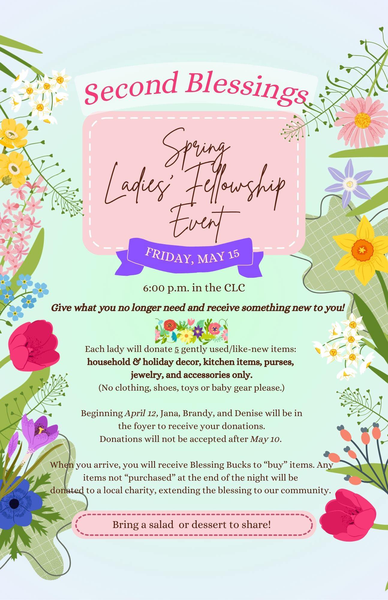 If you would like to provide dishes for a table, please let Joyce Crabtree or the office know.
